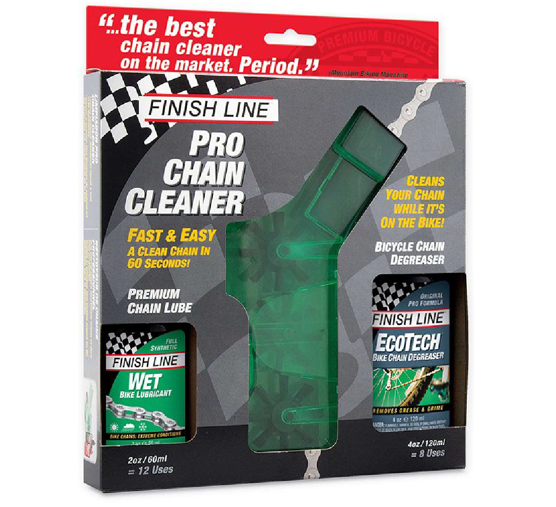 Este Kit de Finish Line contiene el nuevo Pro Chain Cleaner para limpiar tu cadena, ademas incluye un Lubricante Húmedo Sintético Wet Lube de 60ml y un Desengrasante y Limpiador  ECO-TECH de 120ml