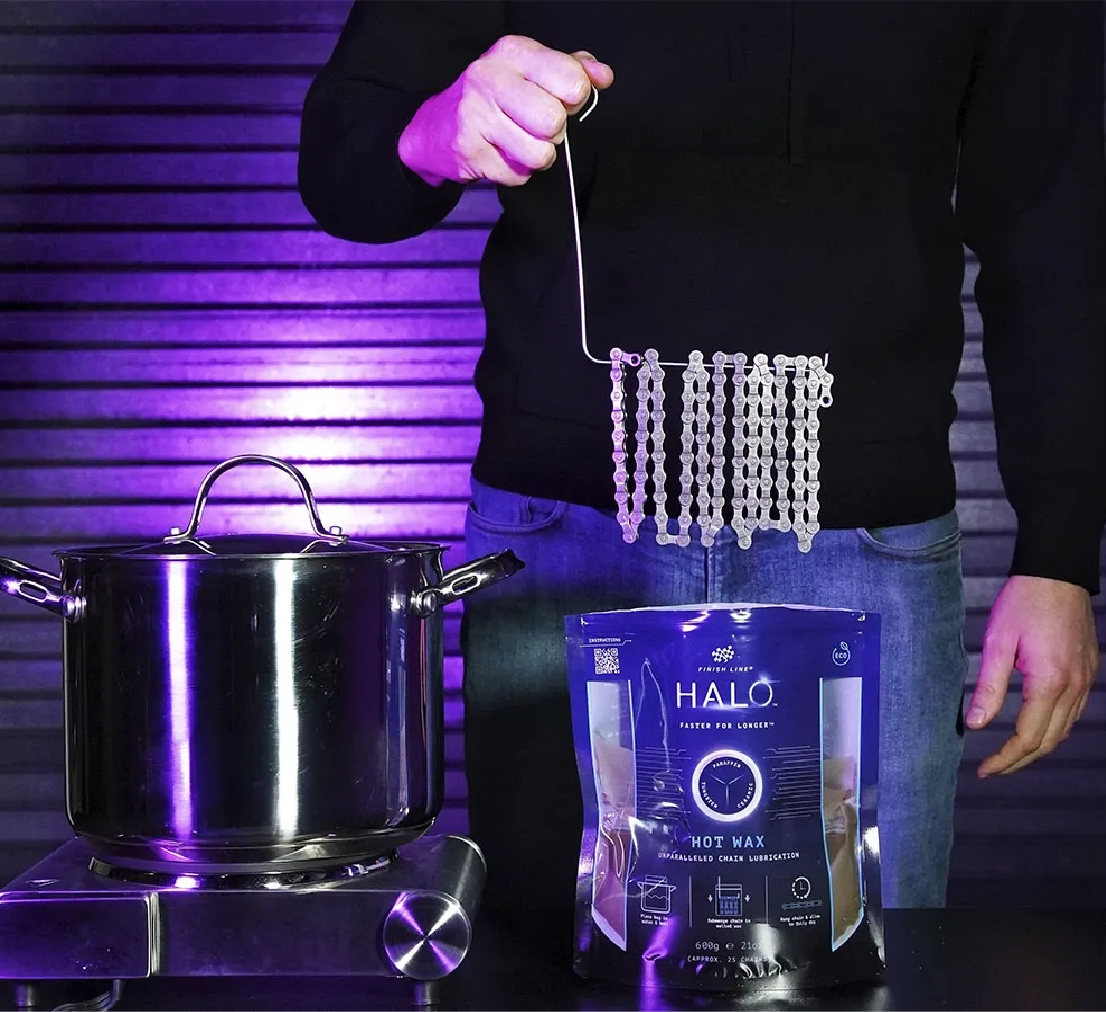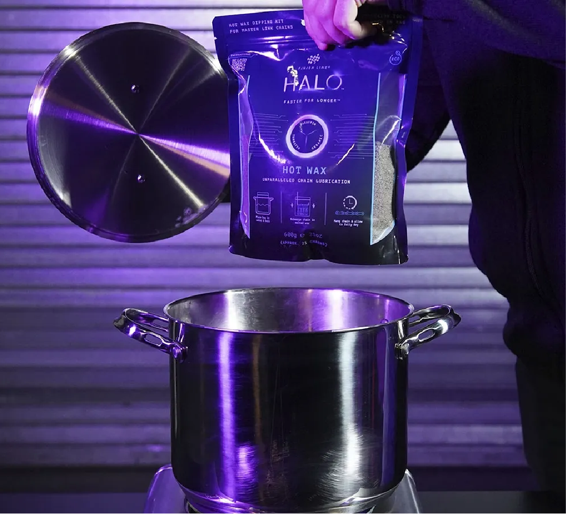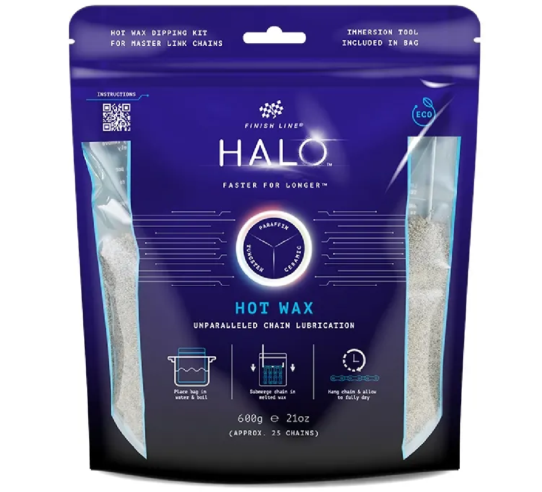 El lubricante para cadenas HALO® HOT WAX está diseñado para mejorar drásticamente el rendimiento de la transmisión tanto en condiciones secas como húmedas al: 1. reducir significativamente la atracción de contaminantes abrasivos. 2. ofrecer un nivel inigualable de reducción de la fricción en la transmisión. 3. garantizar un kilometraje extremo entre intervalos de relubricación.